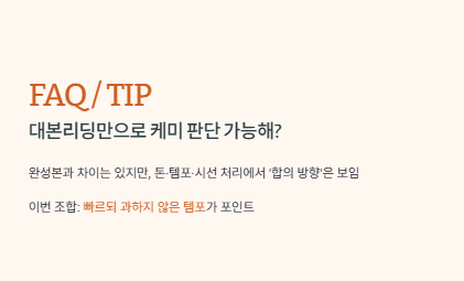 A. 완성본과 차이는 있지만, 톤·템포·시선 처리에서 최소한 ‘합의 방향’은 보인다. 이번 조합은 빠른데 과하지 않은 템포가 포인트.