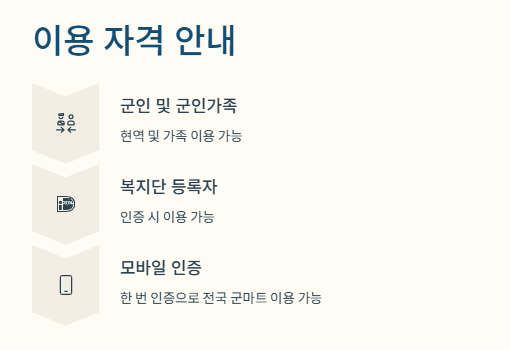 군인 및 군인가족, 복지단 등록자 인증 시 이용 가능합니다. 모바일 인증 한 번 해두면 전국 군마트 사용이 가능해요.