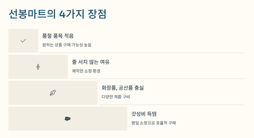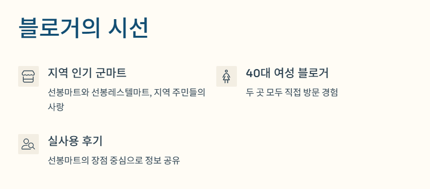 저는 세 번 정도 방문하면서 항상 비슷한 만족도를 느꼈기에, 이제는 용인 군마트 갈 일이 생기면 무조건 선봉마트만 가기로 마음먹었어요. ‘조금 불편하더라도 다양한 품목을 효율적으로 사고 싶다’는 분들께 딱 맞는 곳이랍니다.