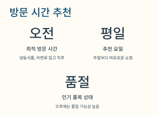 냉동식품, 라면류 등 인기 품목은 오전 입고 후 바로 품절되기 쉬워, 평일 오전 방문이 가장 적기입니다.