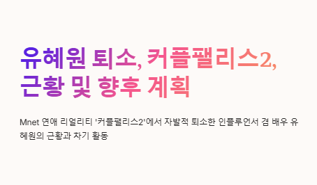 Mnet 연애 리얼리티 프로그램 '커플팰리스2'를 통해 다시금 대중의 주목을 받았던 인플루언서 겸 배우 유혜원이 최종회 전 자발적 퇴소를 선택하며 프로그램에서 떠났다. 이 선택은 단순한 하차 이상의 상징성과 메시지를 지니고 있었다. 이제는 ‘유혜원 퇴소 이후 근황과 차기 활동 정리’에 대해 알아보자.